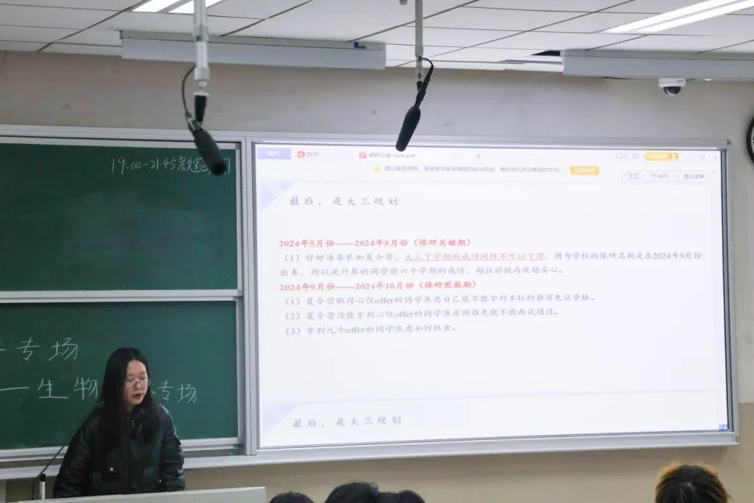 生物技术专业的宋俊辉同学提出保研的首要条件是学习成绩,而了解前沿科技,积极参加科创比赛也同样重要,这能在保研面试中为自己的简历增加一抹亮色。李枭婷学姐指出,有时选择是大于努力的,因此,在选择保研院校时查阅大量资料,多方比较,切忌好高骛远和妄自菲薄,选择最适合自己的院校。‍‍‍‍‍‍‍‍‍‍‍‍‍‍‍‍‍‍‍‍‍‍‍‍‍‍‍‍‍‍‍‍‍‍‍‍‍‍‍‍‍‍‍黄文慧学姐提到,保研是一条漫长的路,积极乐观的心态是必不可少的,凡事预则立,所以要提前准备保研所需的材料,做到有备无患。生物制药专业的周艺同学为大家解读了保研政策,着重强调了四六级的重要性,让与会同学对相关政策有了初步的了解。保研到山东大学的陶雪蕊学姐讲述了保研的流程,突出强调了专业课成绩在保研中的重要性。保研到北京协和医学院的张静学姐就本年级的保研名额进行介绍,就面试中遇到的问题与在座学生展开了交流。