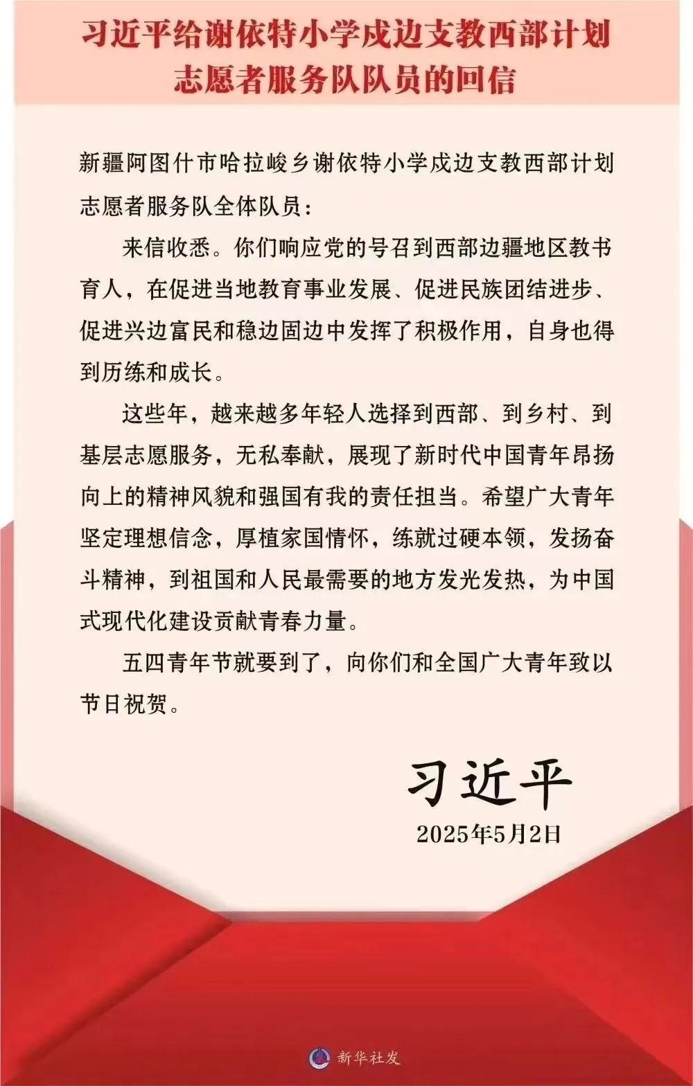 西部计划的志愿者们响应号召,奔赴祖国边疆教书育人,在促进当地教育、民族团结与兴边富民中发光发热。读完习近平总书记给他们的回信后,我深受触动,作为新时代青年,我们应积极响应总书记的号召,向志愿者们学习,坚定理想信念,厚植家国情怀,不断提升本领,为中国式现代化建设贡献自己的青春力量。