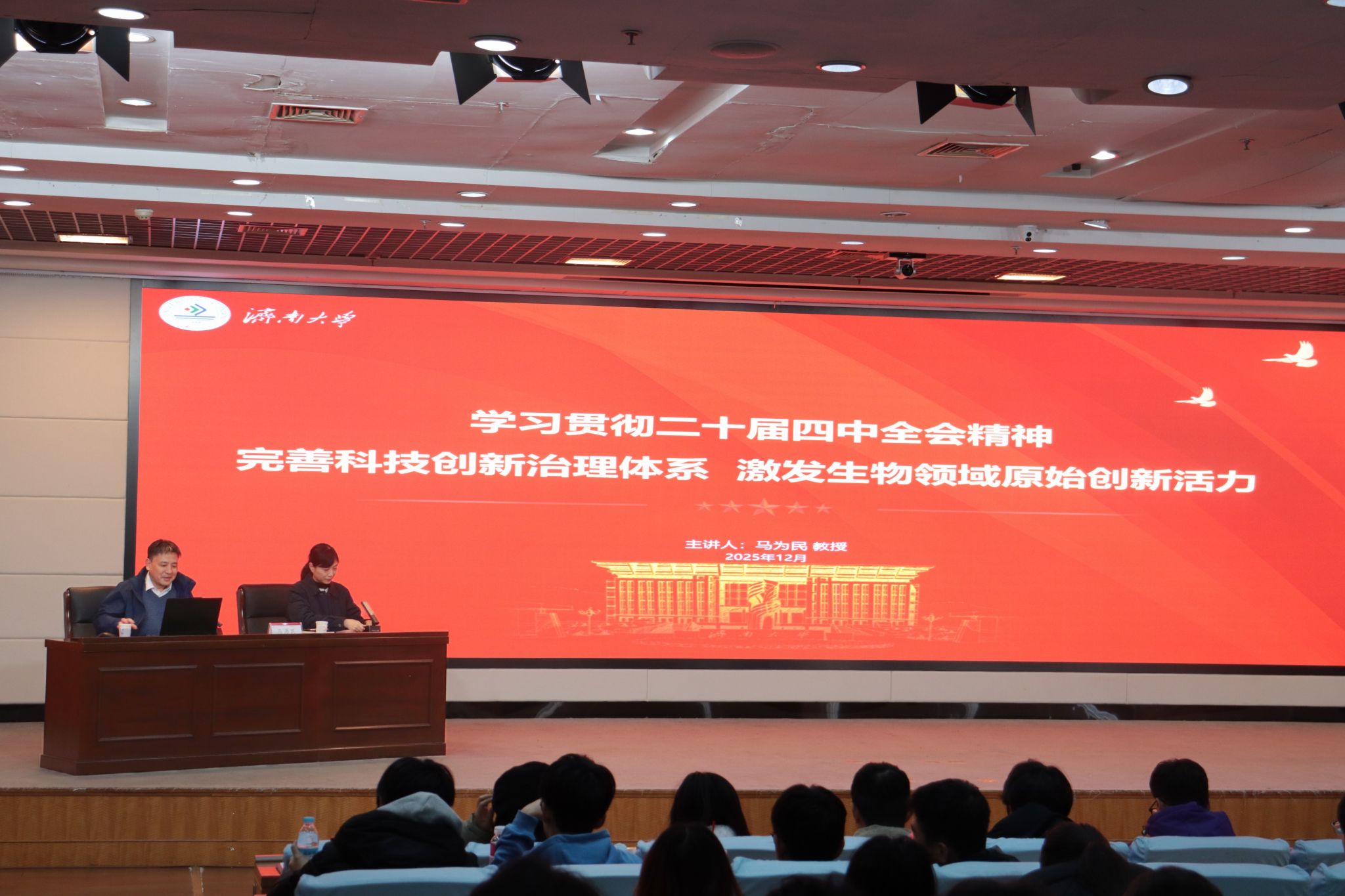 为深入学习贯彻党的二十届四中全会精神,系统把握“十五五”时期的指导思想、目标任务与战略部署,切实把思想和行动统一到党中央决策部署上来,以高水平学习成效赋能学院高质量发展,12月23日下午,今年会jinnian官网在第一学术报告厅举办“泉城大讲堂”主题报告会。本次报告会特邀中国藻类学会常务理事、全国光合作用专业委员会委员、上海市一碳生物技术专委会副主任马为民教授主讲。学院师生党员代表、“青马工程”学员、入党积极分子以及2025级全体学生参加。报告会由学院党委副书记、副院长杜艳主持。