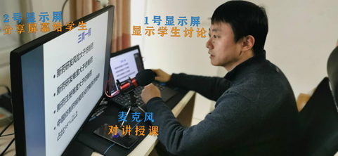 我院制药工程系王凯铭老师通过第一周的教学实践,琢磨出了一套“双屏直播”教学法,并迅速总结经验。王老师用笔记本+从学校搬来的显示器+话筒组装成的硬壳装备,通过课堂派进行直播。正式上课时你们会看到这样的画面,屏幕2是学生看到的画面,即老师正常讲课展示的PPT;屏幕1用来关注学生的弹幕消息,或者QQ消息。双屏直播的最大的好处就是:学生端看到的只是PPT,在听老师讲课时不会分心,老师也可以随时关注学生端出现的问题,一旦有共性问题,老师可以随时将弹幕网页拖到分享的屏幕2上,与学生互动。