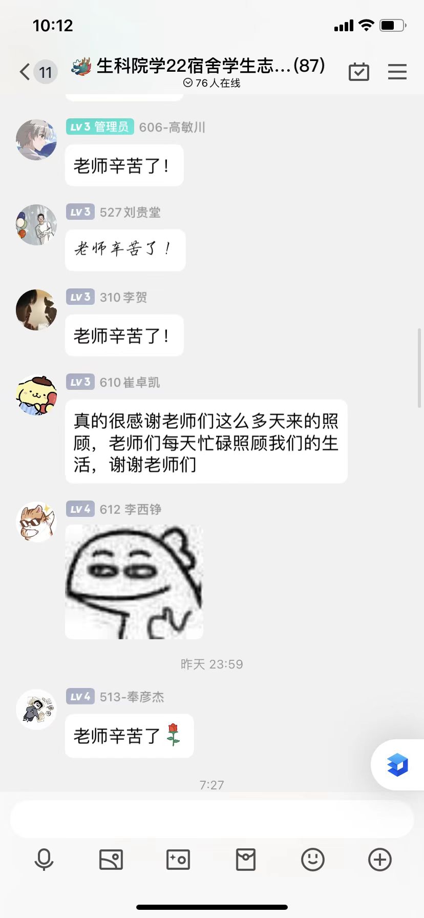 自学校对校园疫情防控实施提级管理以来,学院领导班子统一思想,对学院疫情防控、学生管理、线上教学及科研工作等进行统筹安排,最大限度保障学生学习、生活有序进行。领导和老师多次走访学生宿舍,并通过线上线下方式结合的方式了解学生思想动态和学校生活状态,及时回应学生关切,不断优化暖心服务措施:为静默在公寓楼里的学生购置水果、卫生防疫物资、急需药品;为求职的学生协调面试房间;为考研的学生准备考试礼包;在学院微信公众号推出的疫情暖心提示等等,以真心感动着学生。辅导员老师全天候在线、全身心投入,随时随地与学生谈心谈话、答疑解惑,并为学生们当上校园“快递员”“跑腿员”;班主任老师及时关注班级学生动态,指导学业学习,组织召开“共同抗疫 守护家园”线上主题班会,进一步坚定师生同心、共同抗疫的信念,以真情感染着学生。通过努力,学院上下更深刻地提高思想认识,师生“肩并肩”“心连心”,凝聚战疫强大合力,为学生身心健康保驾护航。