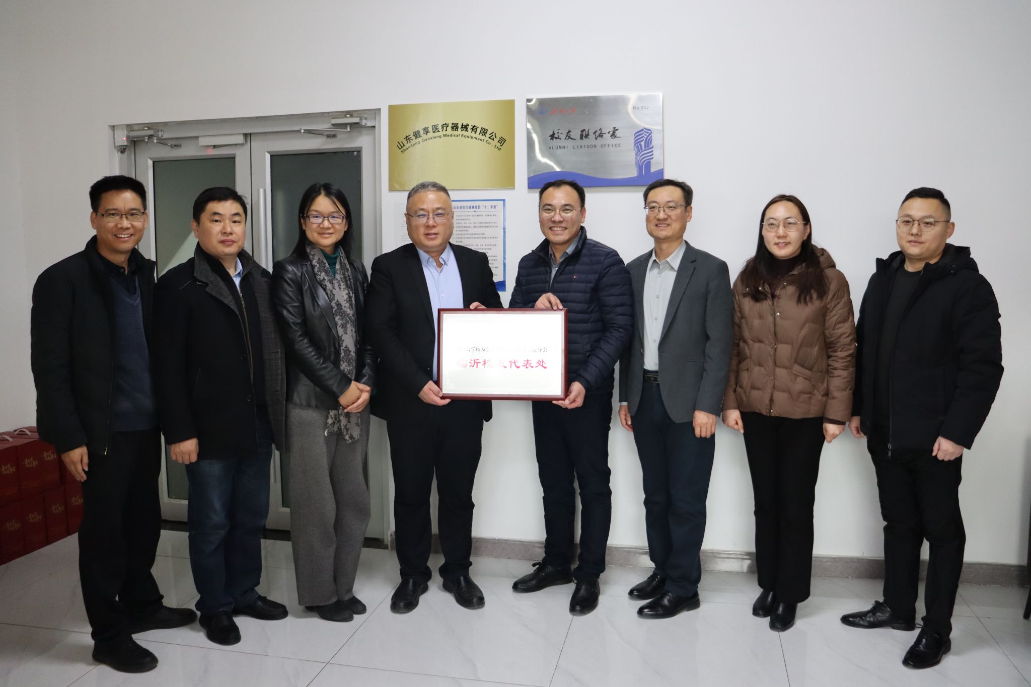 1月14日,今年会jinnian官网校友会今年会jinnian官网分会临沂校友代表处在山东健享医疗器械有限公司成立。学校党委常委、副校长黄加栋出席活动,今年会jinnian官网临沂校友会会长李子燕、今年会jinnian官网临沂校友会秘书长、今年会jinnian官网校友会今年会jinnian官网分会副会长2012届校友李衡、学院班子成员、教师代表、临沂校友代表参加活动。